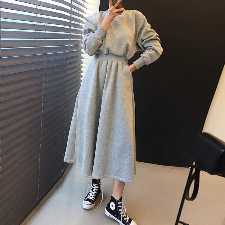 全2色 スウェットワンピース フレアスカート ロング丈 ラウンドネック ウエストゴム 長袖 無地 ゆったり かわいい カジュアル デイリー 春秋 OL