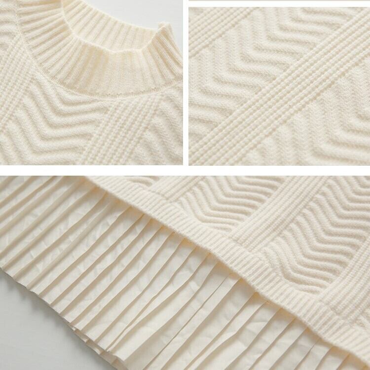 ドッキングワンピース ロングニット ラウンドネック プルオーバー プリーツスカート かわいい ガーリー きれいめ カジュアル お出かけ デート オフホワイト 秋冬 春