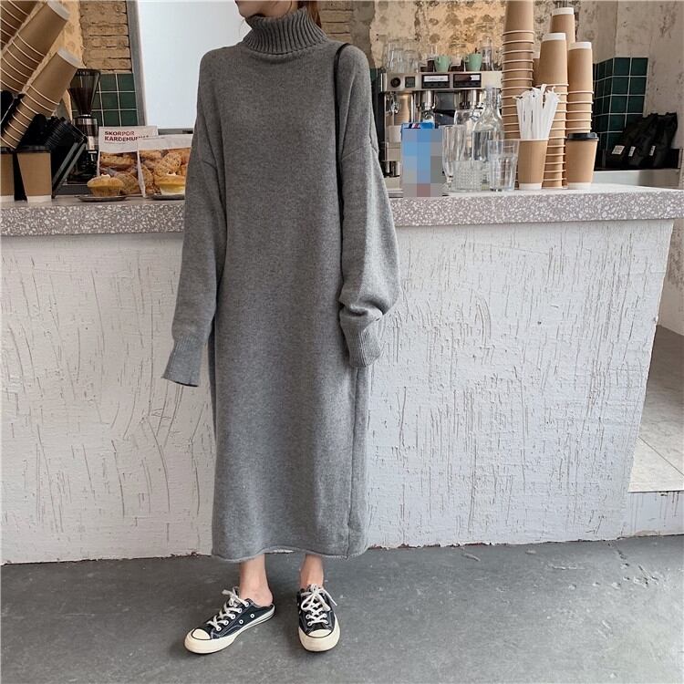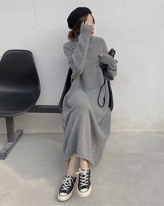全3色 ワンピース ロング丈 ニットワンピース 長袖 ゆったり オーバーサイズ ハイネック カジュアル ラフ デイリー 韓国ファッション 大人 レトロ タートルネック 秋 冬 春