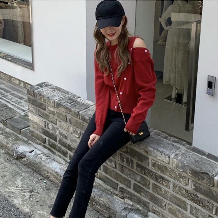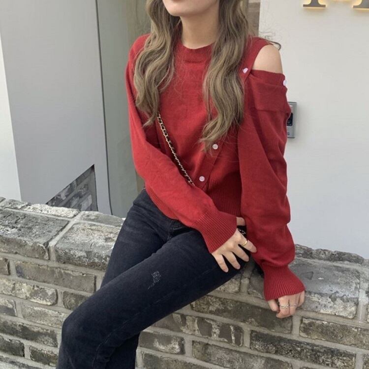 全3色 ニットトップス ラウンドネック プルオーバー 長袖 オープンショルダー 2WAY 無地 カジュアル セクシー お出かけ デート レッド グリーン ブルー