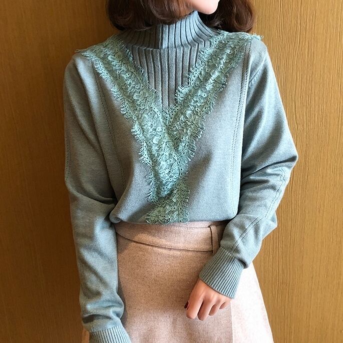 全2色トップス ニット セーター プルオーバー レース ガーリー 可愛い デート カジュアル 大人可愛い ハイネック スリム 秋 冬 春