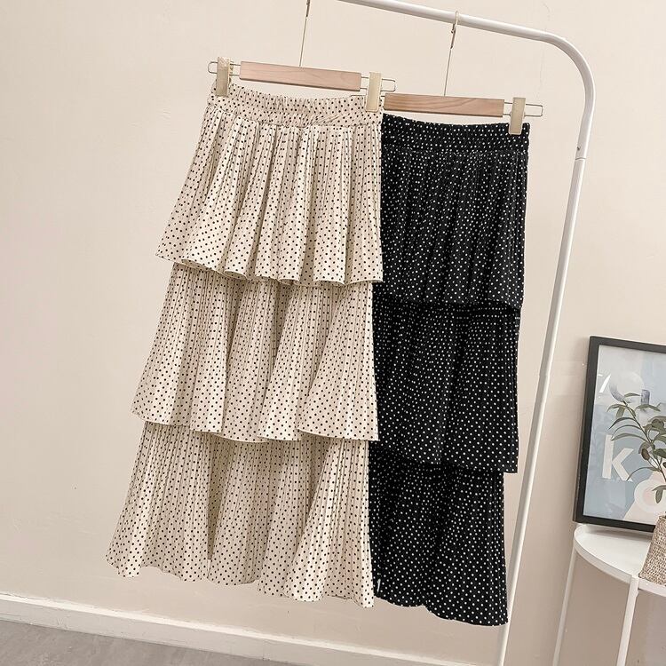 全3色 ロングスカート ティアードスカート 3段フリル ドット ウエストゴム ゆったり きれいめ ガーリー お出かけ カジュアル デート ブラック アプリコット グリーン