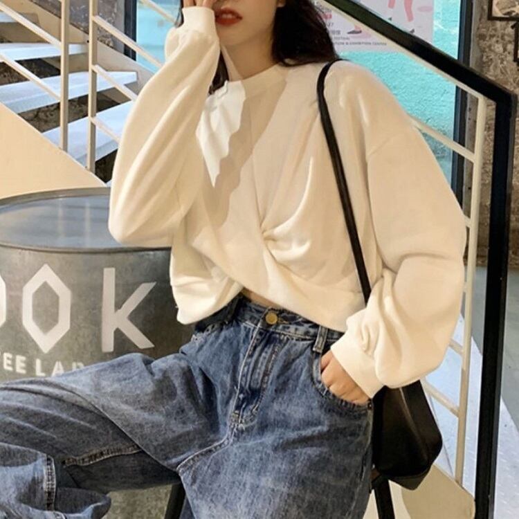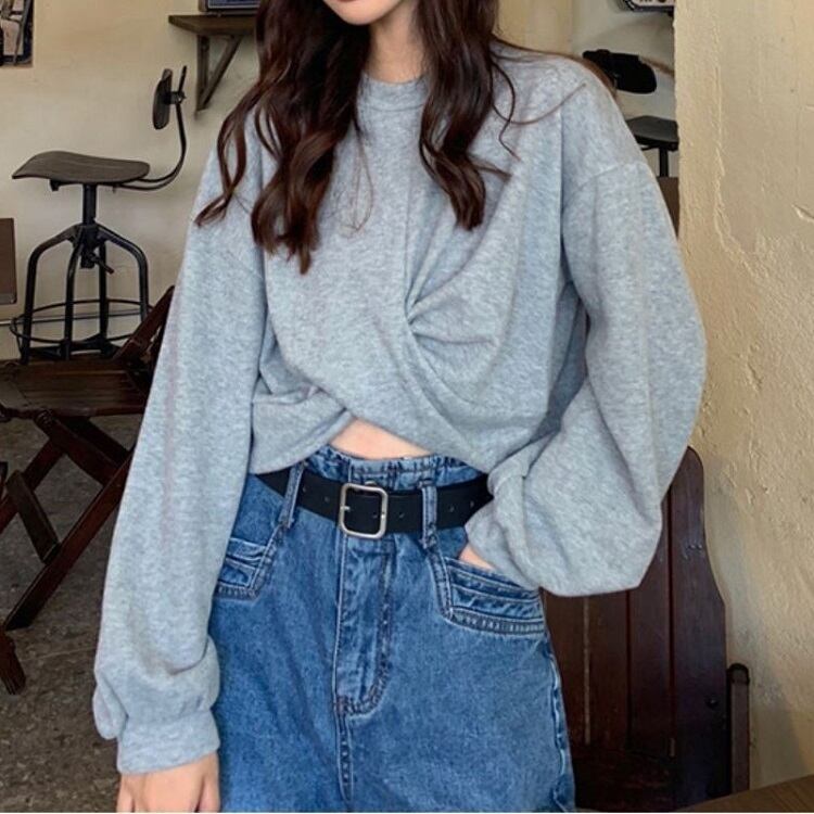 全3色 トレーナー カットソー ショート丈 チラ見せ ラウンドネック 長袖 プルオーバー ゆったり カジュアル かわいい お出かけ デート グレー ブラック ホワイト