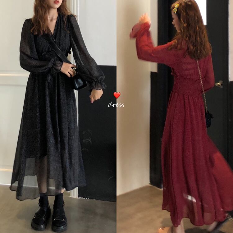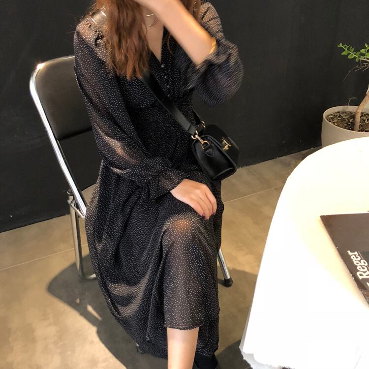 全2色 ワンピース シフォン ドット柄 水玉 ロング丈 Vネック フリル ウエストマーク 長袖 シースルー フレア きれいめ カジュアル デート ボタン ガーリー 可愛い 韓国ファッション 春 秋 夏