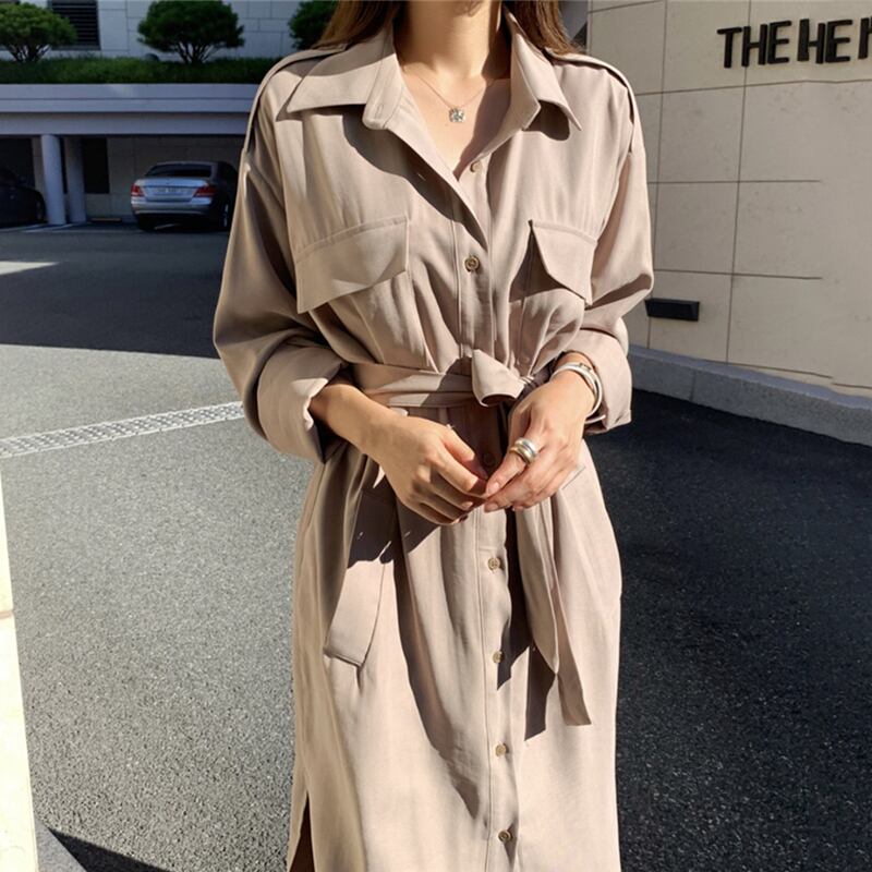 シャツワンピース ワンピース フロンボタン ウエストリボン 無地 長袖 上品 カジュアル デート サイドスリット デイリー ロング丈 ゆったり 大人 韓国ファッション シンプル 秋 夏