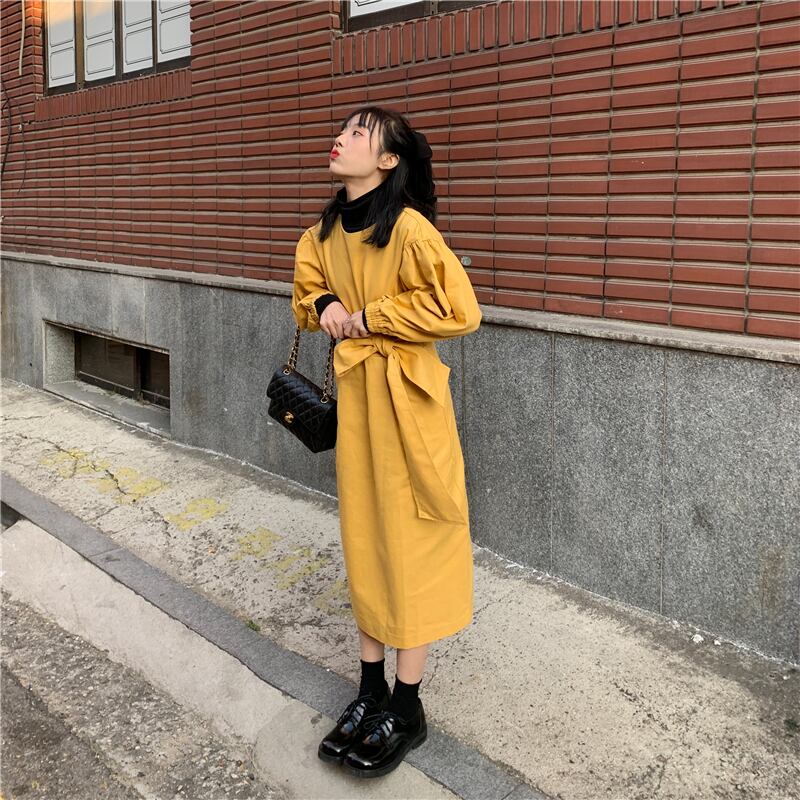 ツーピース 2点セット インナー ワンピース ウエストリボン ロング丈 ゆったり ラウンドネック カジュアル きれいめ デート 大人 韓国ファッション レトロ 長袖 無地 春 冬