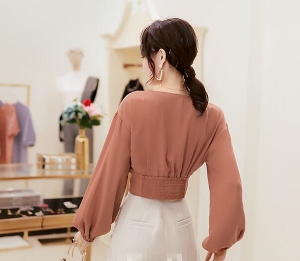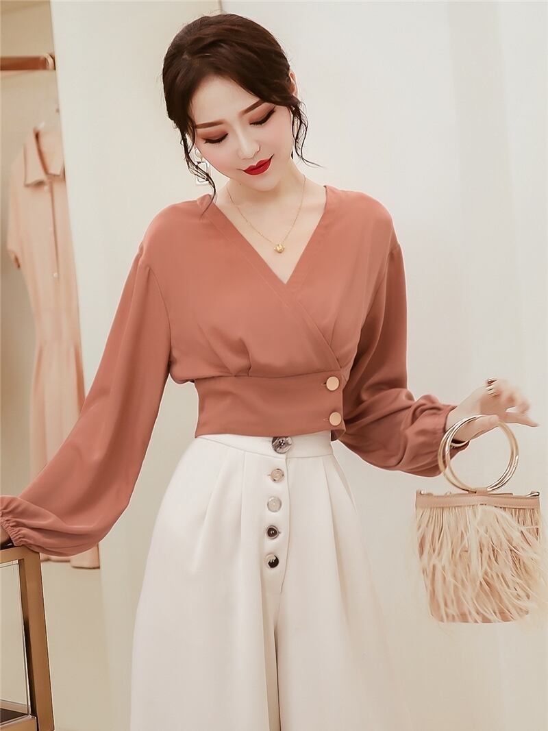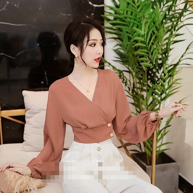 全2色トップス ブラウス カシュクール 長袖 スリム サイドボタン Vネック きれいめ カジュアル 上品 パフスリーブ 大人 デート 女子会 ショート 秋 春 夏