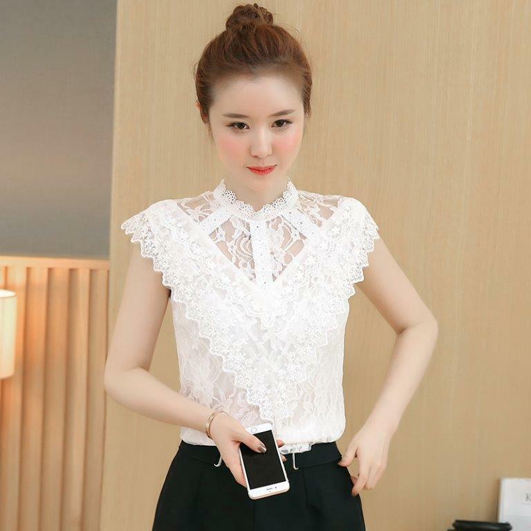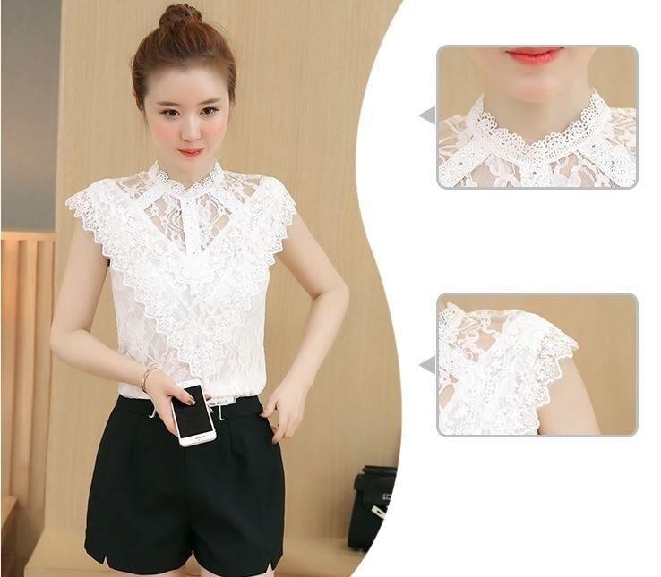 ブラウス ハイネック 半袖 レース ホワイト大人可愛い 春夏