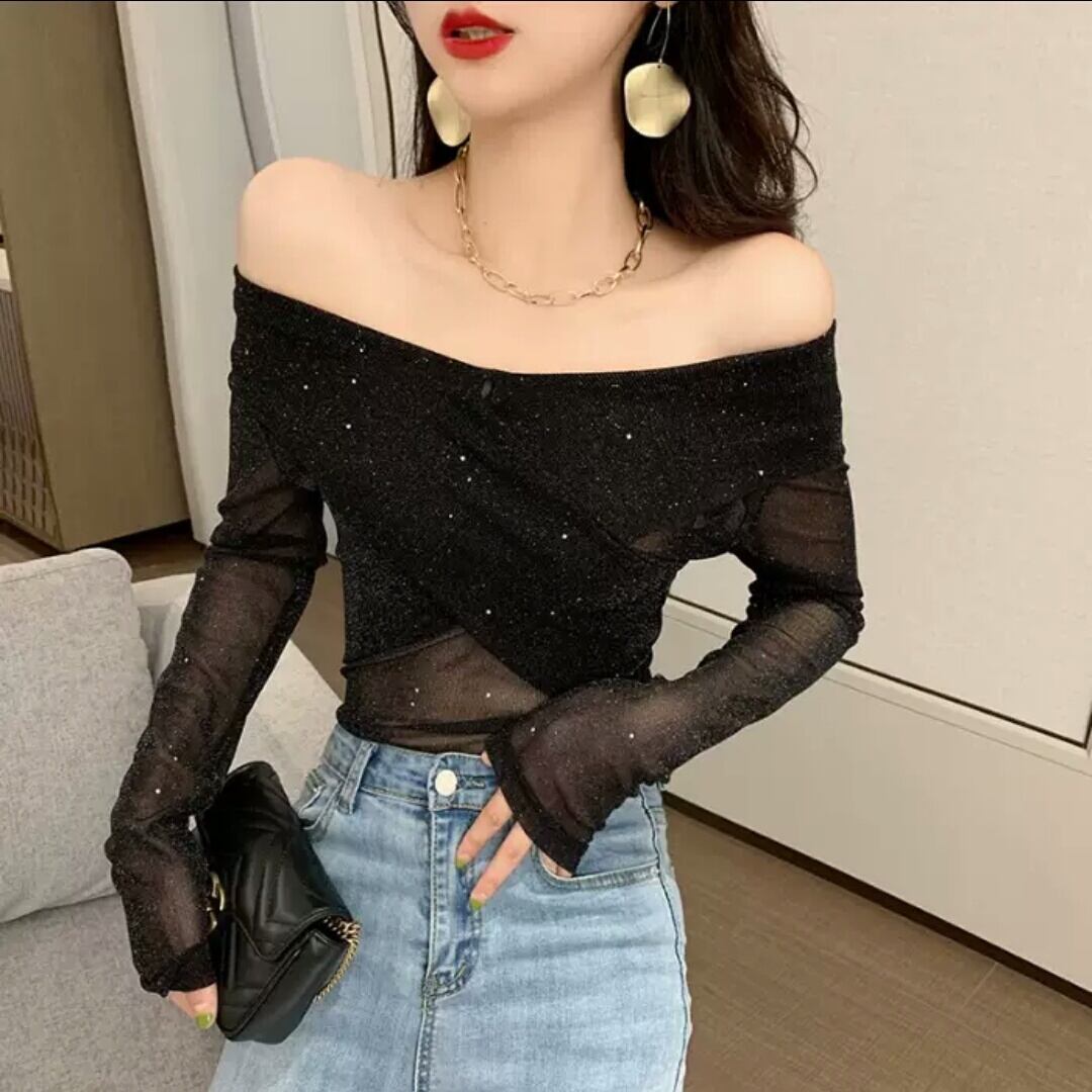 全2色 キラキラ オフショルダー タイト 長袖 トップス カットソー 大人 キレイめ エレガント 上品 セクシー カジュアル お出かけ お買い物 デート 女子会 春 夏 通学 学生 通勤 韓国ファッション