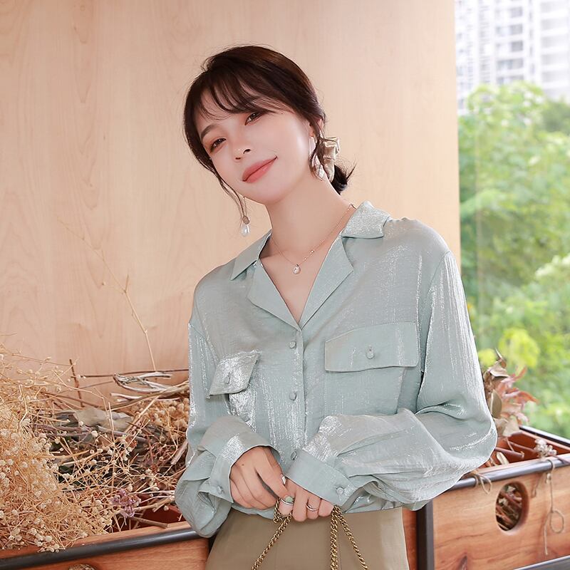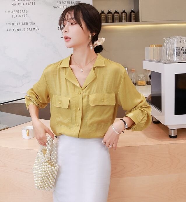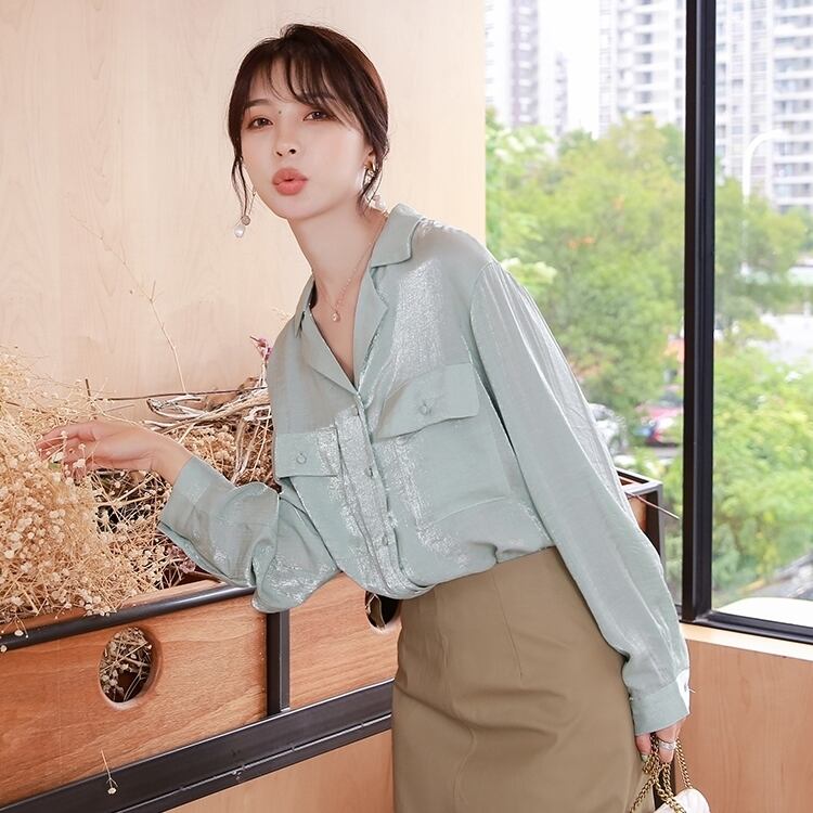全3色 トップス シャツ ブラウス シルク フロントボタン ポケット ゆったり 光沢 上品 カジュアル きれいめ 長袖 大人可愛い 女子会 無地 春 夏
