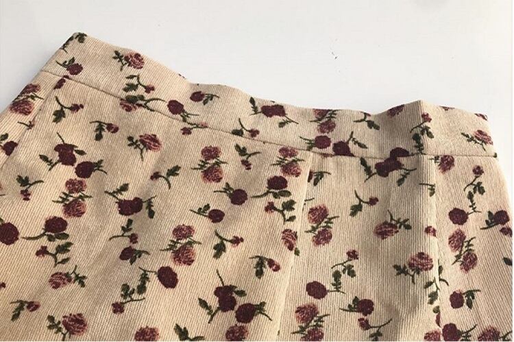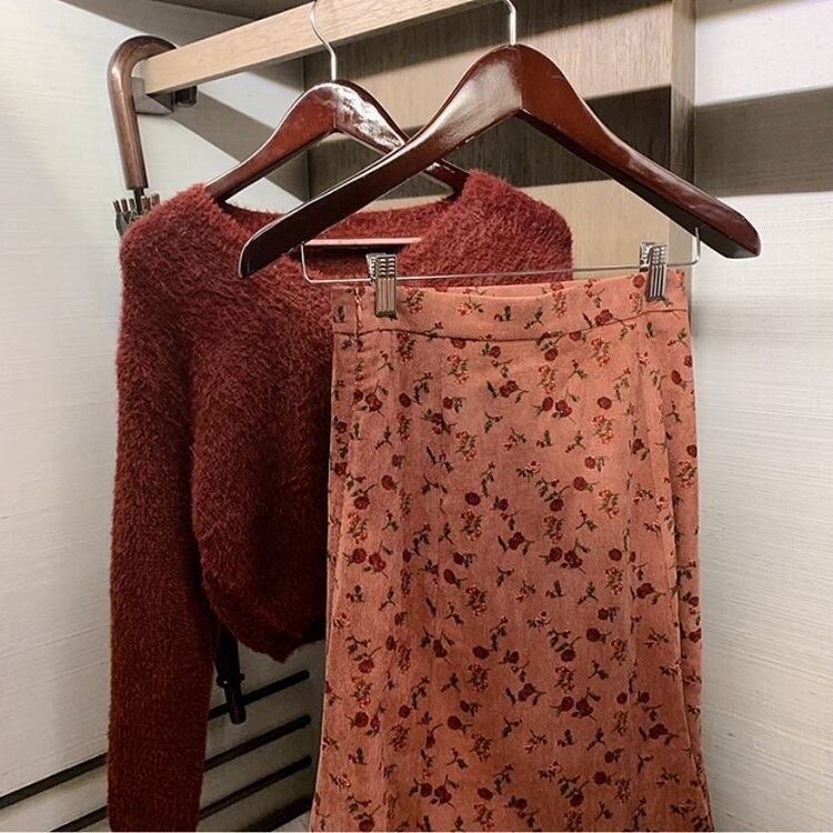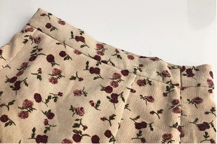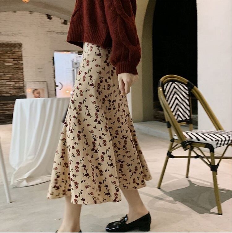 落ち着いた配色の花柄が大人っぽいコーデュロイスカート。