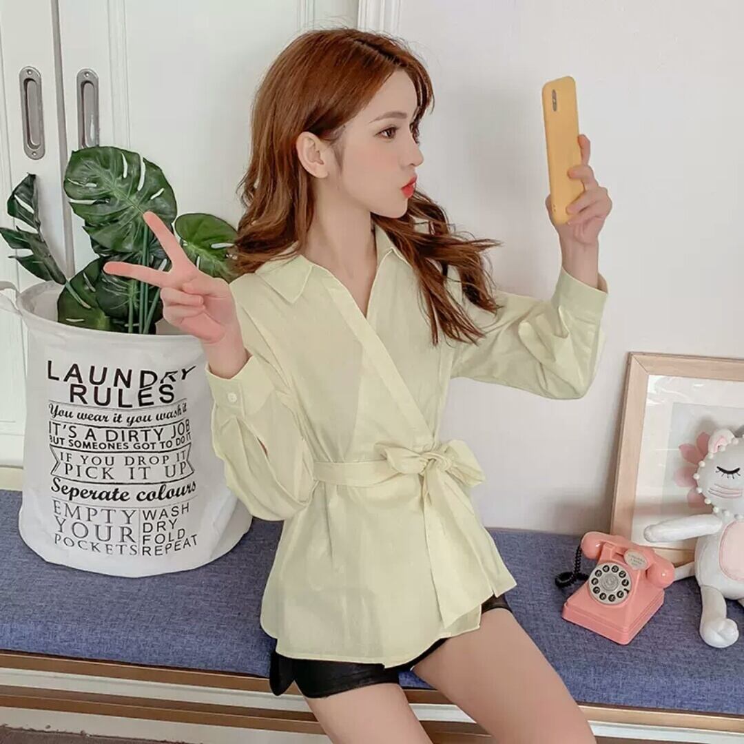 全2色 Vネック ウエストリボン シャツ 薄手 シンプル 無地 大人 カジュアル 可愛い キレイめ お出かけ お買い物 デート 女子会 春 夏 通学 学生 通勤 韓国ファッション