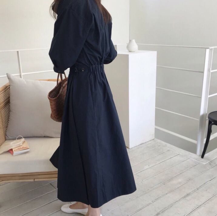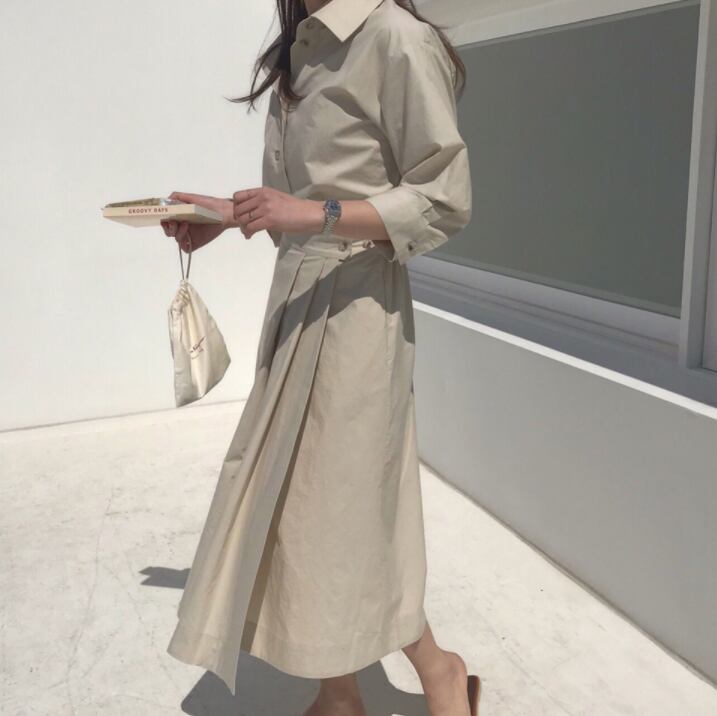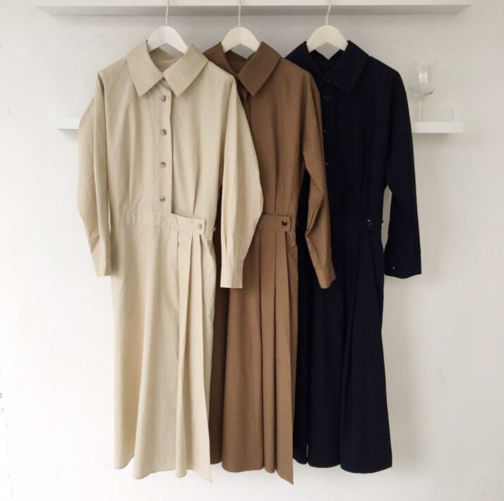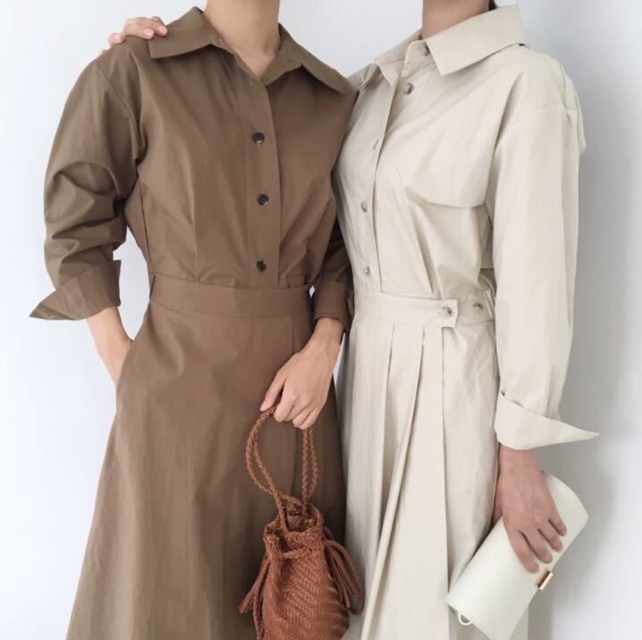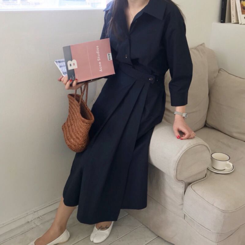 全3色 ワンピース ロング丈 フロントボタン シャツワンピース フェイクツーピース ウエストマーク 無地 タック ポケット フレア カジュアル きれいめ 上品 大人 韓国ファッション 春 夏