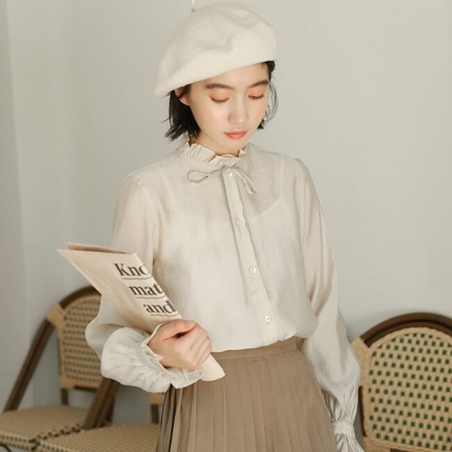 トップス ブラウス シャツ フリルネック ハイネック リボン ボウタイネック トランペットスリーブ 長袖 無地 上品 カジュアル きれいめ シンプル 大人 デート 女子会 春 夏