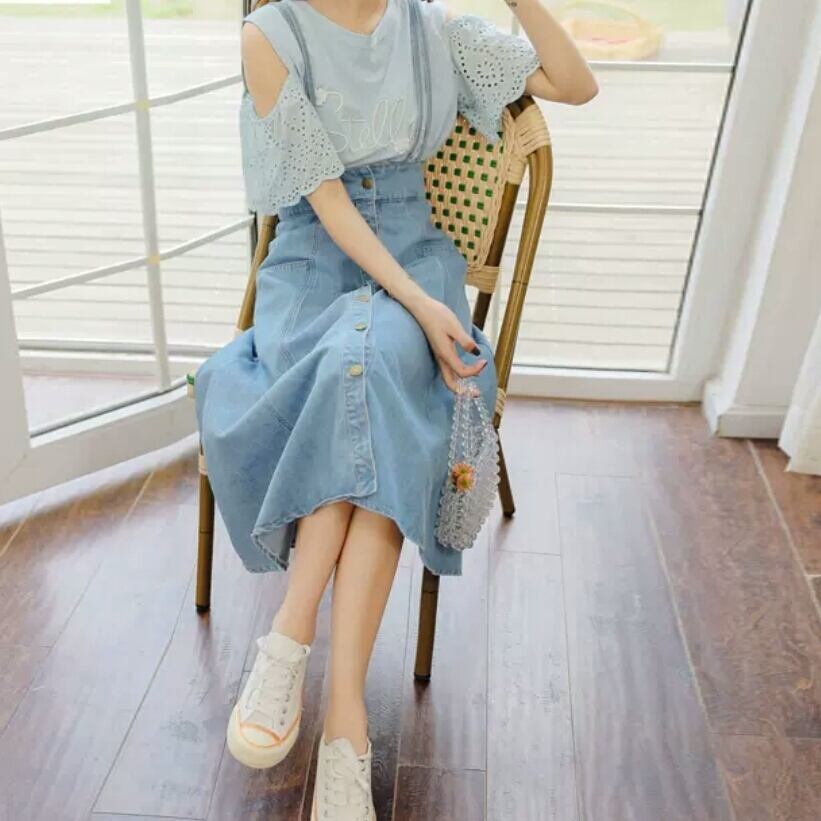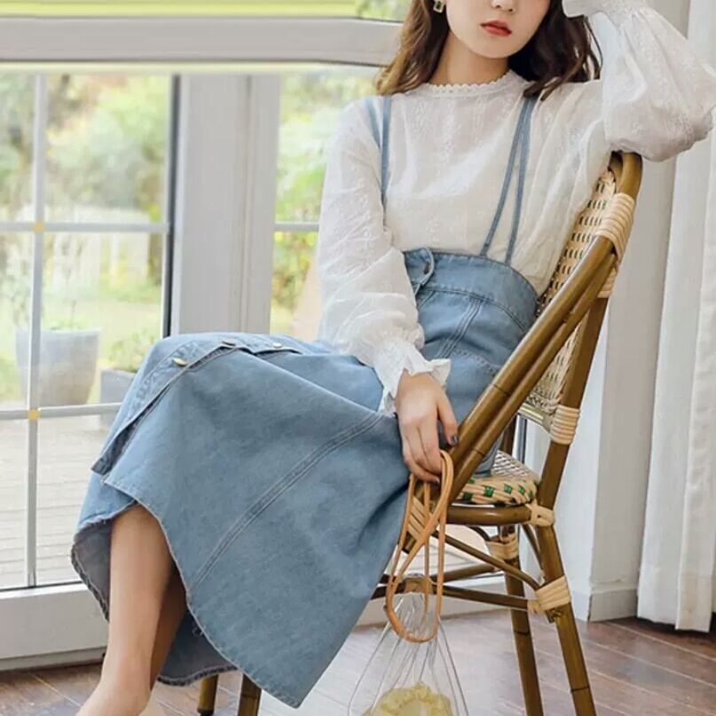 ストラップ デニム スカート ミドル丈 ブルー 大人 カジュアル 可愛い キレイめ シンプル お出かけ お買い物 デート 女子会 春 夏 通学 学生 通勤 韓国ファッション