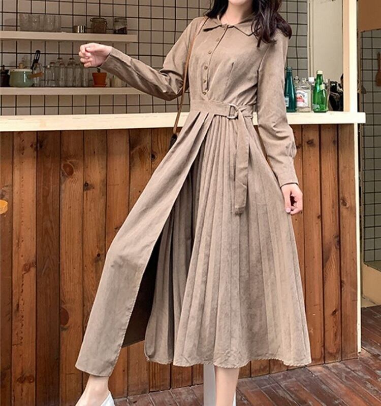 大きいサイズ ロングワンピース シャツワンピース プリーツスカート 長袖 ウエストリボン レトロ カジュアル お出かけ お呼ばれ デート 春