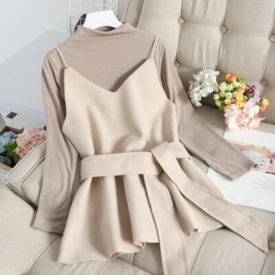 全6色 ツーピース 2点セットトップス カットソー キャミソール プルオーバー レイヤード フリル 長袖 バイカラー ガーリー 可愛い きれいめ リボン カジュアル 大人 秋 冬 春