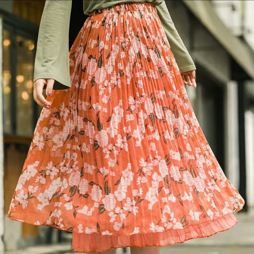 花柄 リバーシブル プリーツ ロング丈 スカート 無地 シンプル 大人 カジュアル 可愛い キレイめ リゾート お出かけ お買い物 デート 女子会 春 夏 通学 学生 通勤 韓国ファッション