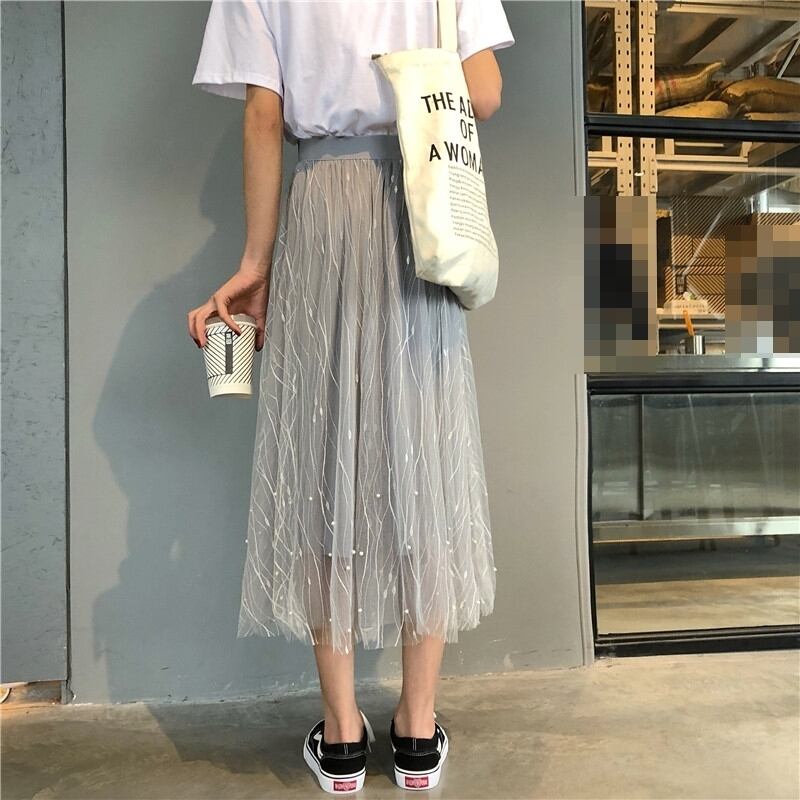 全3色 チュールスカート ロング丈 シースルー ゆったり ビジュー パール