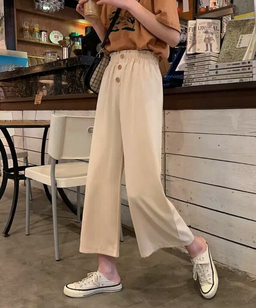 全2色 ワイドパンツ 九分丈 ゆったり 無地 ボタン 秋冬 ハイウエスト ウエストゴム
