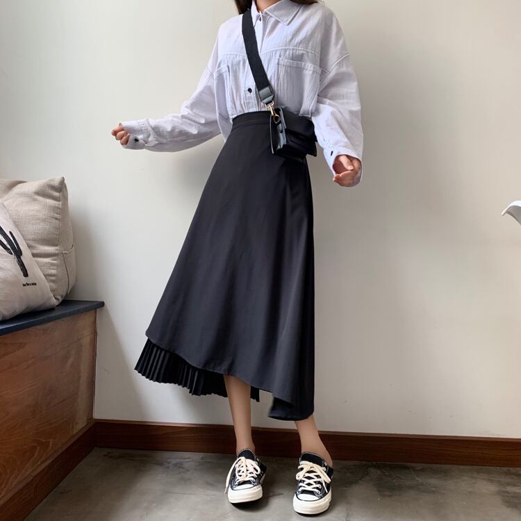 ロングスカート アシンメトリースカート プリーツ ブラック 秋 冬 バックウエストゴム 大人カジュアル 学生 通学 韓国 オルチャン
