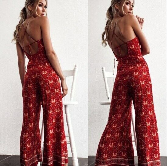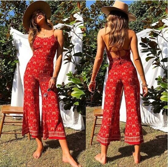 オールインワン エスニック風 スリング ジャンプスーツ バックシャン ハイウェスト セクシー キャミソールタイプ 楽ちん