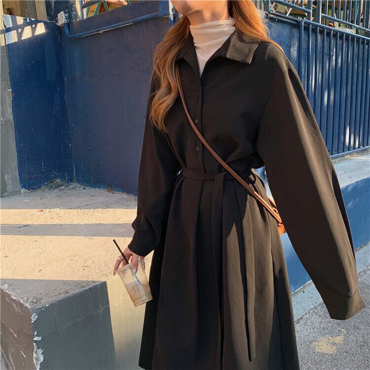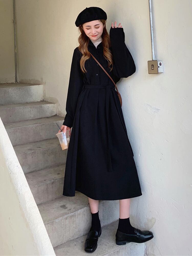 ワンピース ミモレ丈 シャツワンピース ウエストリボン 長袖 無地 モノトーン ダーク 大人 カジュアル Aライン フロントボタン 上品 春 夏