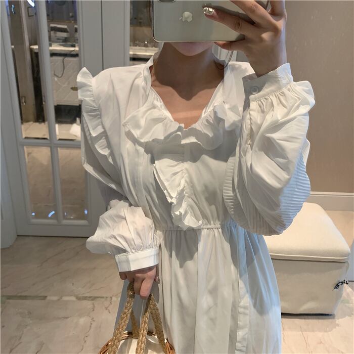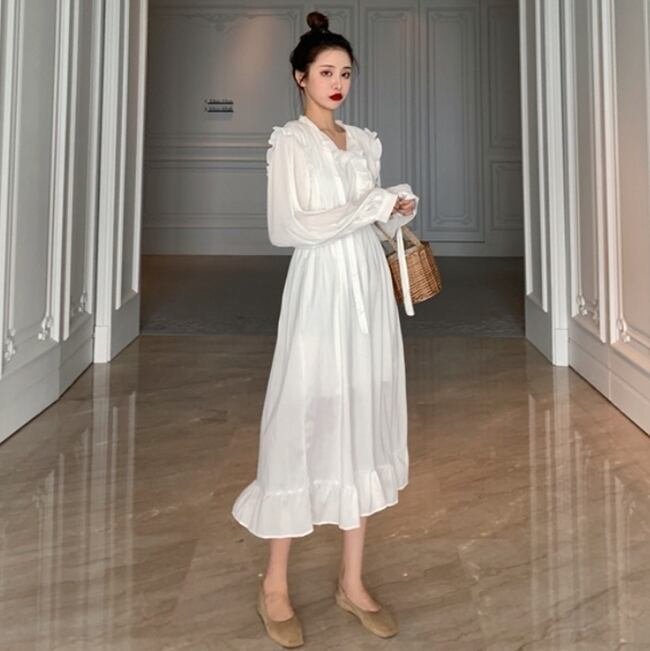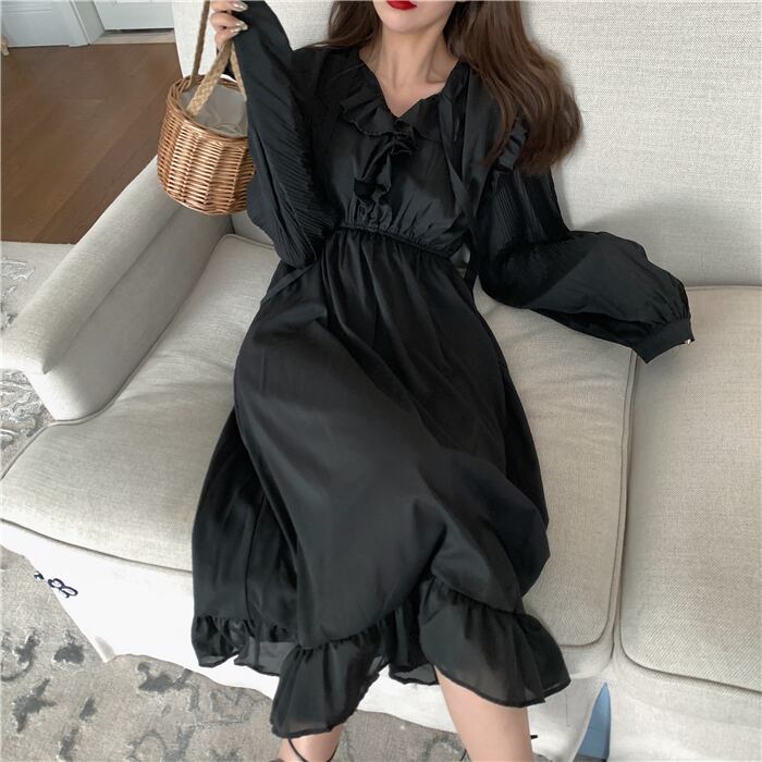 全2色 ワンピース ミモレ丈 フリル フレア Vネック ウエストマーク ゆったり 長袖 上品 ガーリー 大人可愛い カジュアル 無地 デート きれいめ 女子会 春 夏