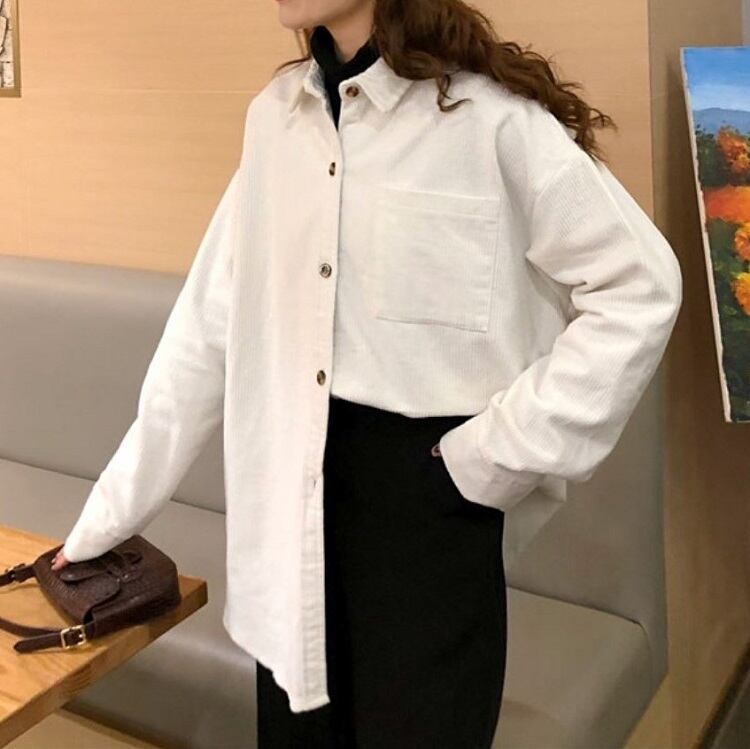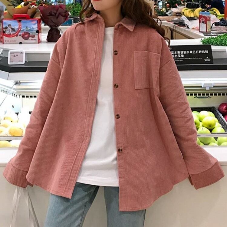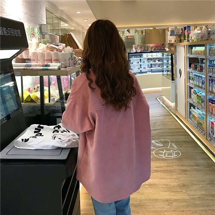 全4色 コーデュロイシャツ 長袖 無地 レトロ 大きめ オーバーサイズ ゆったり 羽織り カジュアル お出かけ デート デイリー 普段着 ブルー ホワイト イエロー ピンク