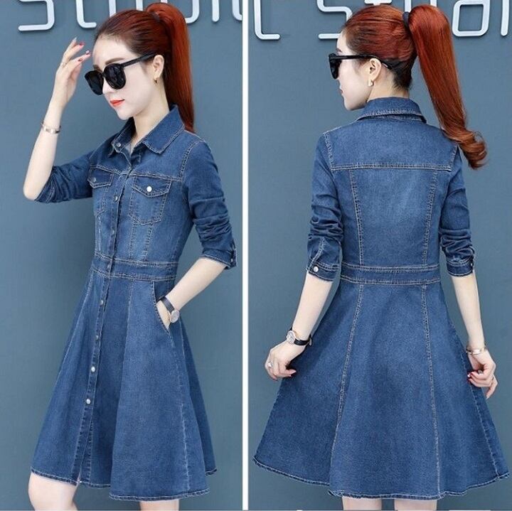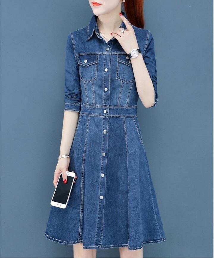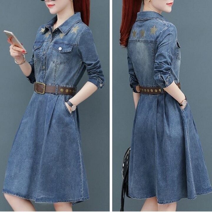 全2種 ワンピース デニムワンピース ひざ丈 フレアスカート フロントボタン 星柄 長袖 かわいい カジュアル お出かけ デート デニムブルー