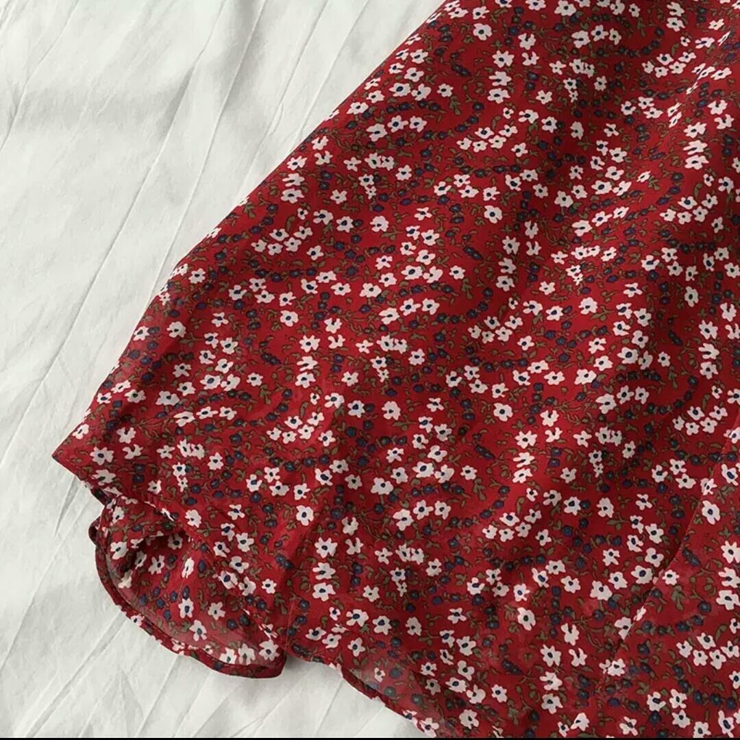 花柄 ハイウエスト ミドル丈 スカート レッド 赤 フラワー 大人 カジュアル 可愛い キレイめ お出かけ お買い物 デート 女子会 春 夏 秋 通学 学生 通勤 韓国ファッション