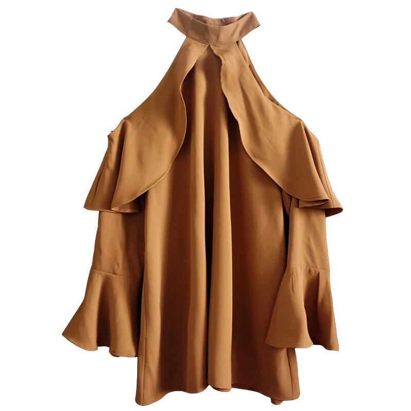 全3色 トップス ブラウス 肩見せ フリル ゆったり フレアスリーブ ホルターネック 長袖 上品 きれいめ セクシー ゆったり ハイネック 秋 夏 春