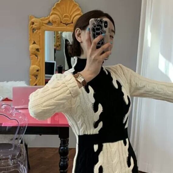 ハイネック ニット スリム タイト ワンピース コントラスト 柄 ミドル丈 大人 カジュアル キレイめ 可愛い 個性的 お出かけ お買い物 デート 女子会 春 秋 通学 学生 通勤 韓国ファッション