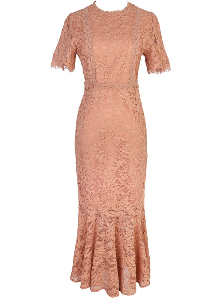 全3色 ワンピース ドレス ミモレ丈 レース 総レース 半袖 マーメイド フリル フレア シースルー クルーネック タイト スリム シック 上品 パーティー お呼ばれ エレガント