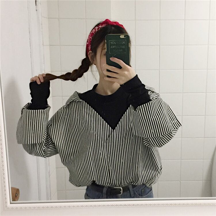 長袖シャツ ブラウス フェイクシャツ ラウンドネック ブラックストライプ 抜き襟 重ね着風 ゆったり カジュアル お出かけ デート デイリー 普段着