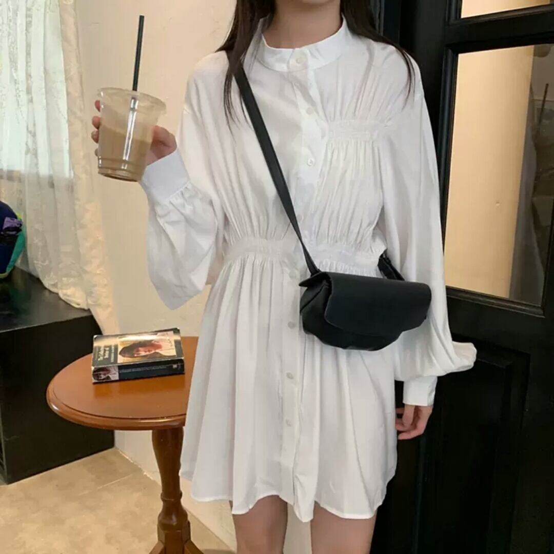 全2色 パフスリーブ 長袖 ワンピース 無地 シンプル ショート丈 大人 可愛い キレイめ カジュアル お出かけ お買い物 デート 女子会 春 夏 通学 学生 通勤 韓国ファッション