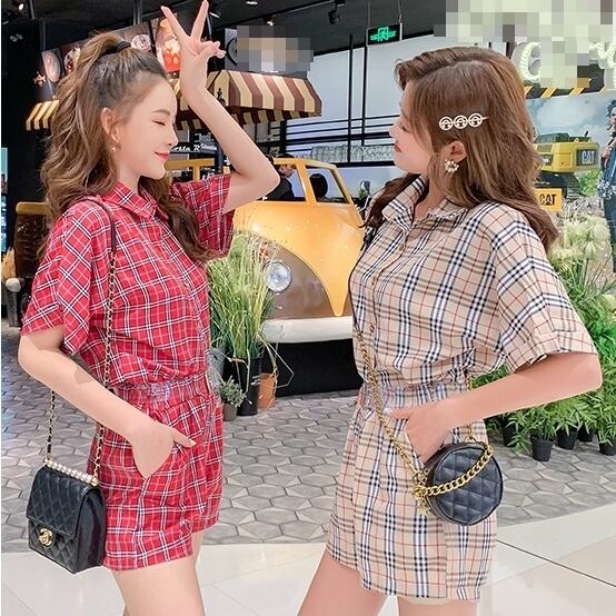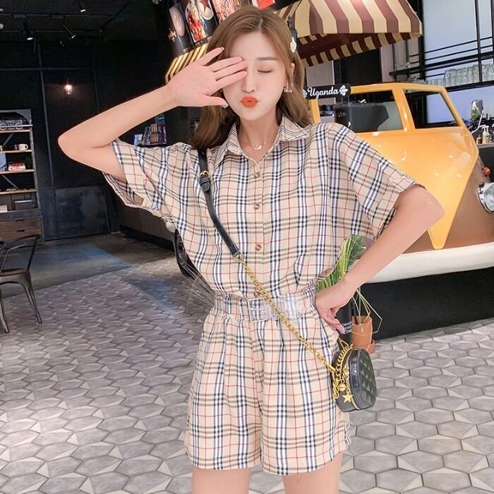 全2色 セットアップ ツーピース トップス ショートパンツ シャツ チェック柄 ベルト スリム フロントボタン 上品 5分袖 ハイウエスト カジュアル デート 女子会 夏