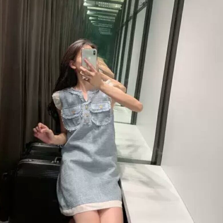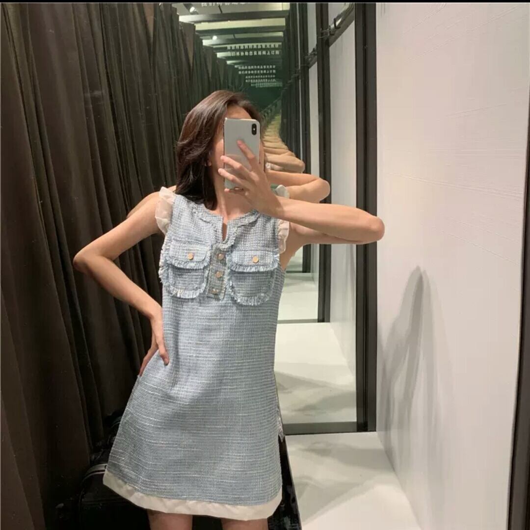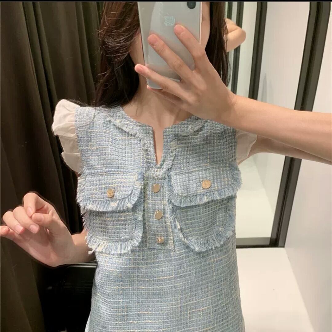 ノースリーブ ツイード ドレス フリル ショート丈 大人 キレイめ エレガント イベント パーティー お出かけ お買い物 デート 女子会 春 夏 通学 学生 通勤 韓国ファッション
