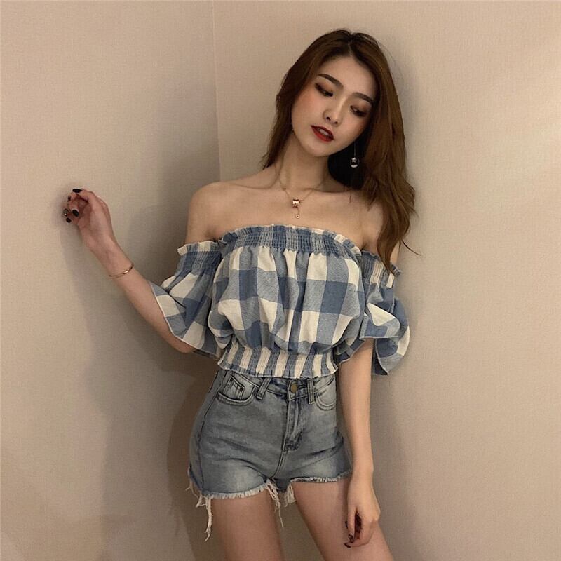 全2色 トップス ブラウス チェック柄 ショート オフショルダー ペプラム へそ出し スリム フレアスリーブ カジュアル きれいめ デート ガーリー セクシー 可愛い 春 夏