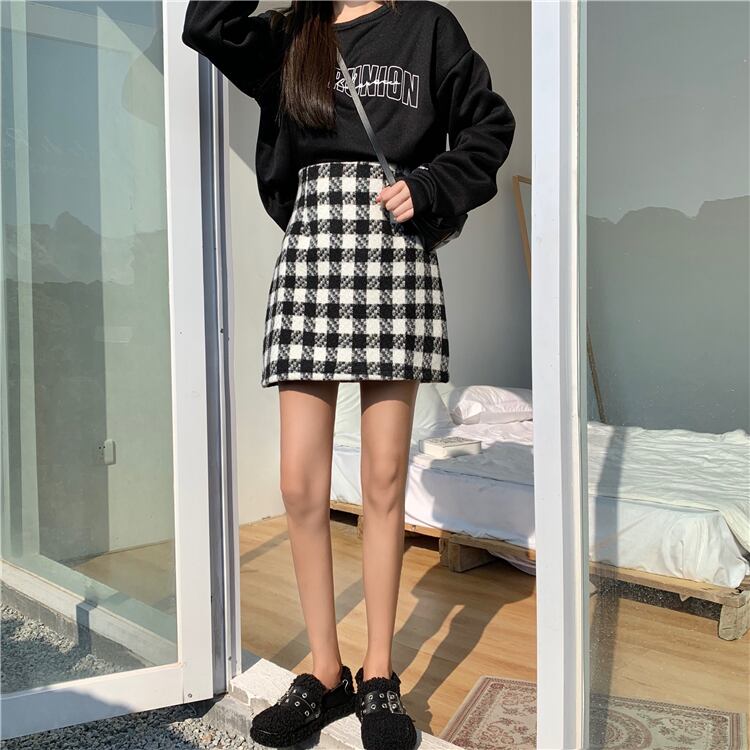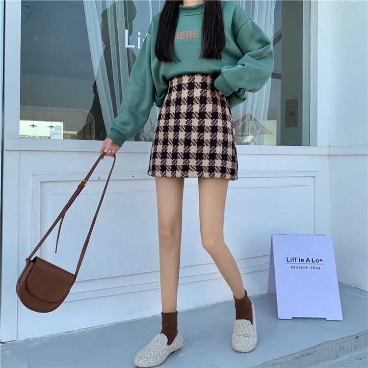 全3色 スカート ミニスカート ウール チェック 格子 レトロ 台形 ハイウエスト シンプル カジュアル お出かけ デート 通学 グレー ブラウン ブラック 秋冬