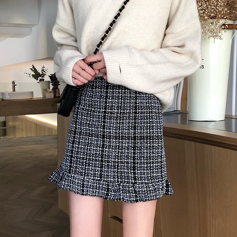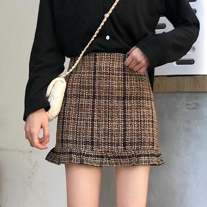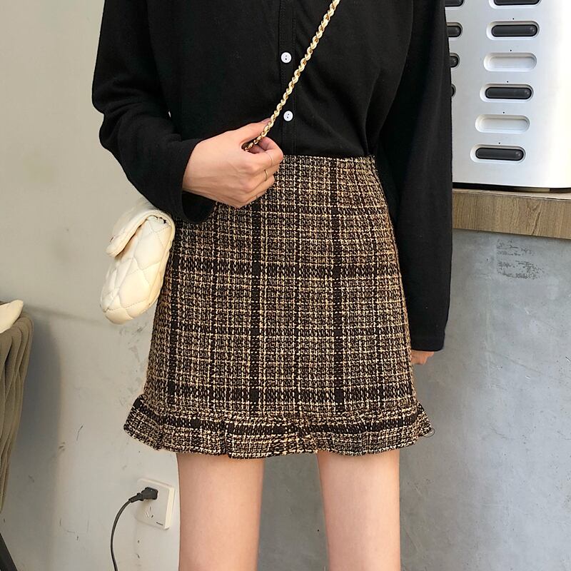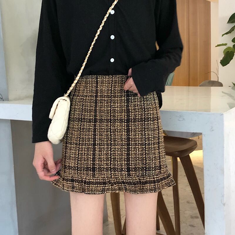 全2色 スカート ミニスカート チェック 格子 フリル ハイウエスト シンプル カジュアル お出かけ デート 通学 ブラウン ブラック