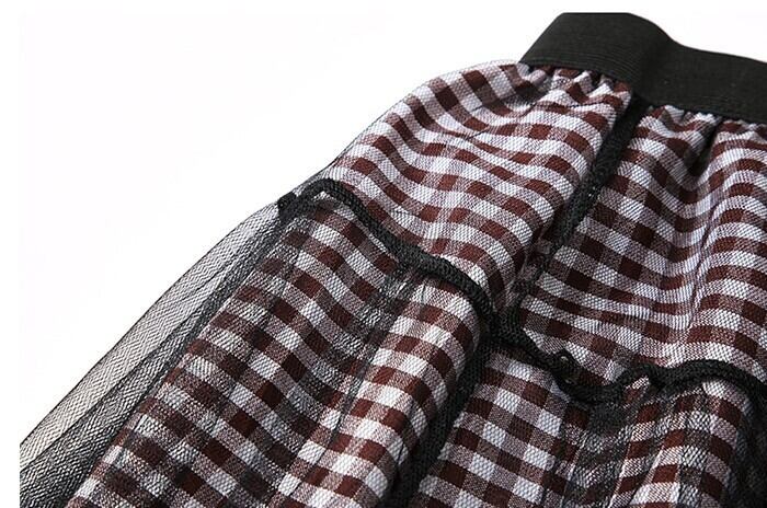 ティアードスカート ダブルスカート フィッシュテール メッシュ ギャザー ギンガムチェック ウエストゴム ゆったり ガーリー お出かけ カジュアル デート ブラウン