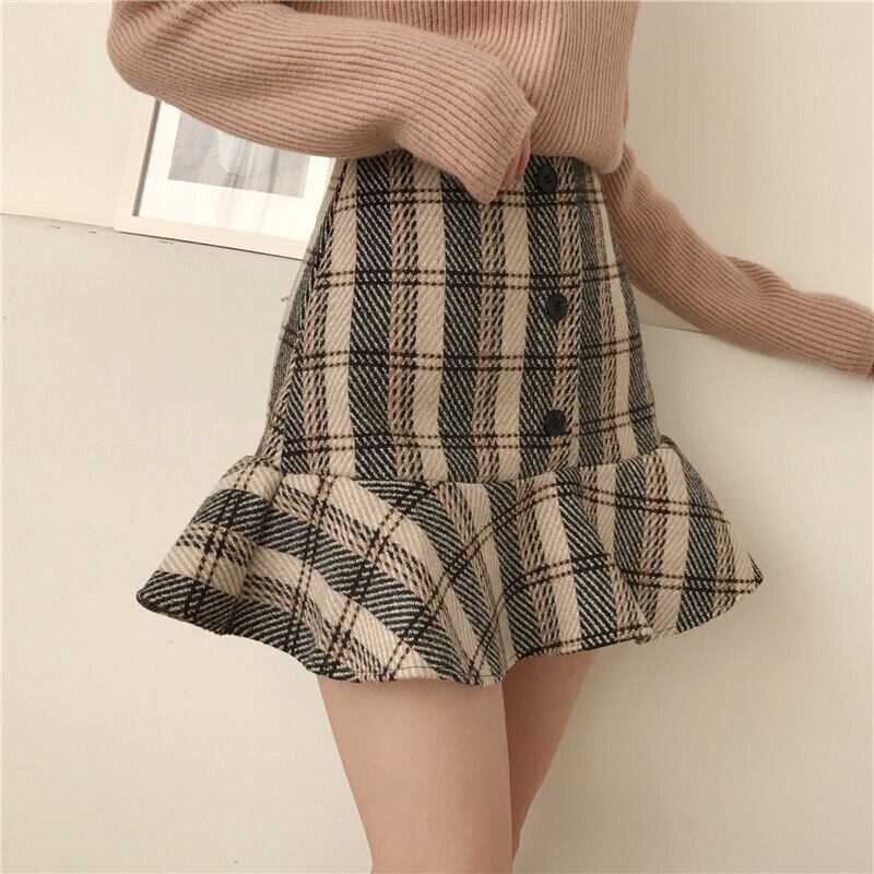 全2色 ペプラムスカート ミニスカート チェック柄 アプリコット ブラック ハイウエスト フロントボタン 通学 学生 レトロ 韓国 オルチャン