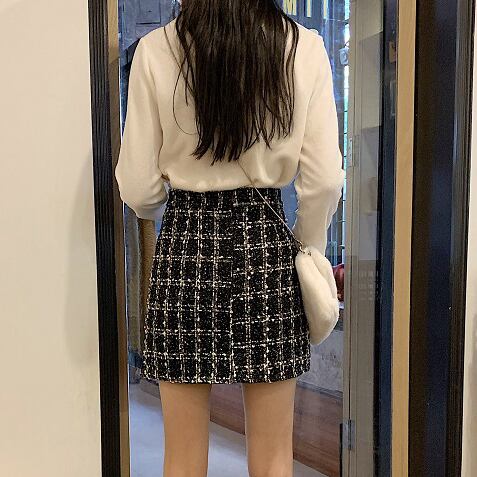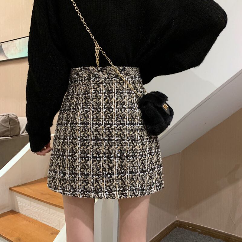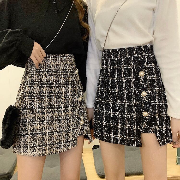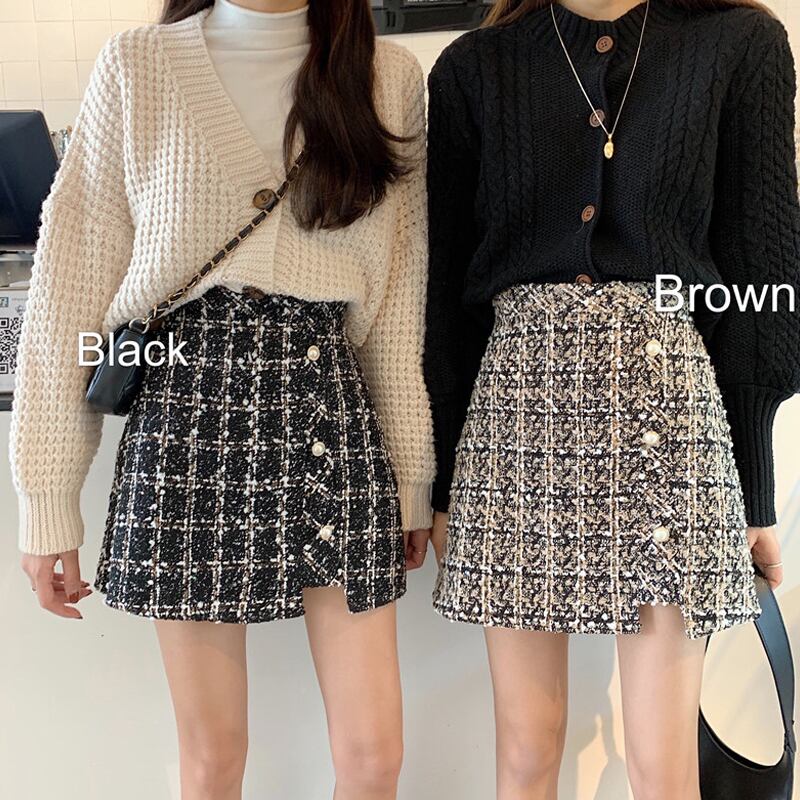 全2色 ツイード Aライン スカート ミニスカート ミニ丈 ショート丈 ハイウエスト パール ボタン 大人 カジュアル 可愛い シンプル キレイめ デート ブラウン ブラック 春 秋 冬