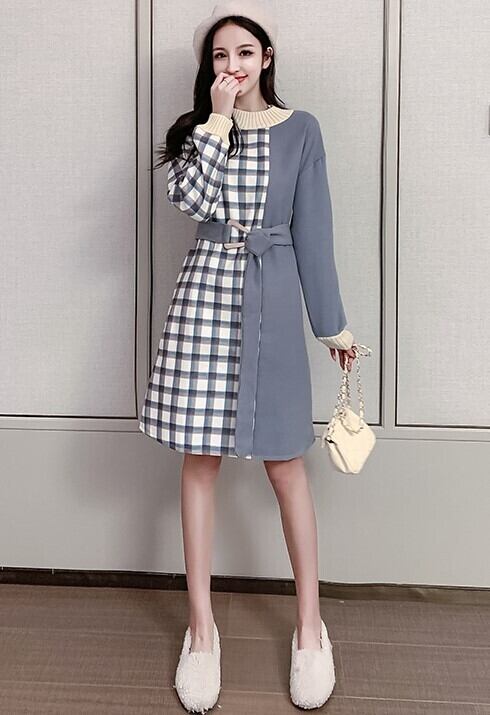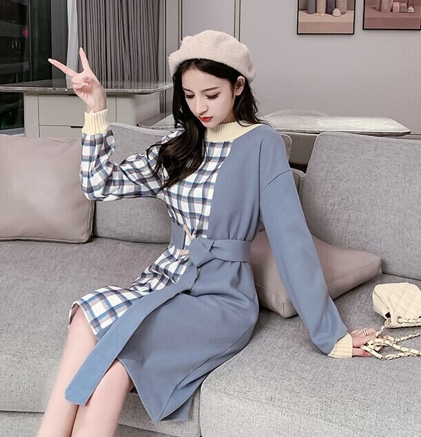全2色 ニットワンピース ドレス チェック柄 ハイネック 長袖 バイカラー ベージュ ブルー ひざ丈 ウエストベルト 上品 エレガント 通勤 通学 オフィスカジュアル デート 韓国 オルチャン 秋 春