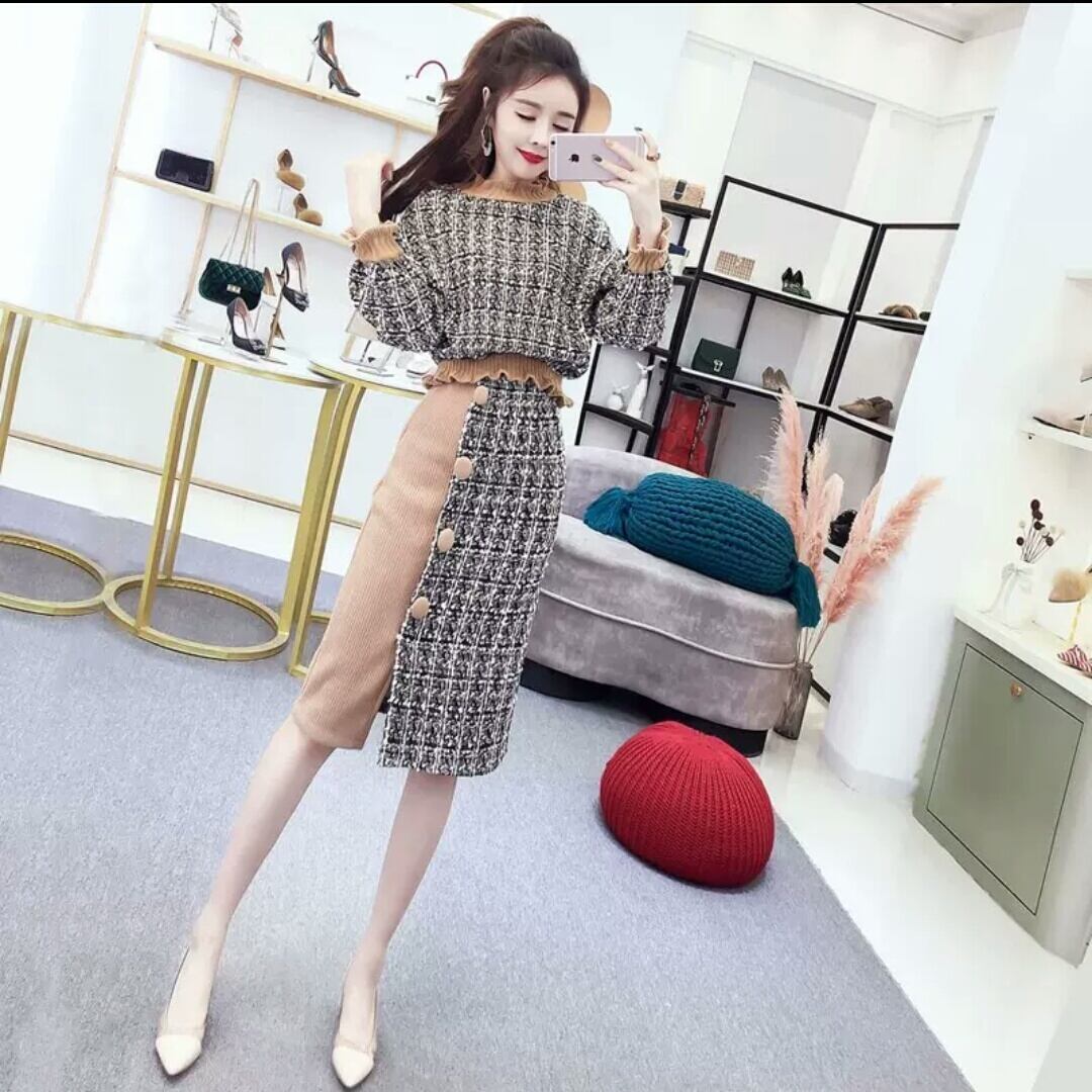 全2色 ニット セットアップ スカート ひざ丈 ミディアム丈 チェック柄 大人 キレイめ エレガント お買い物 お出かけ デート 女子会 秋冬 春 通学 通勤 学生