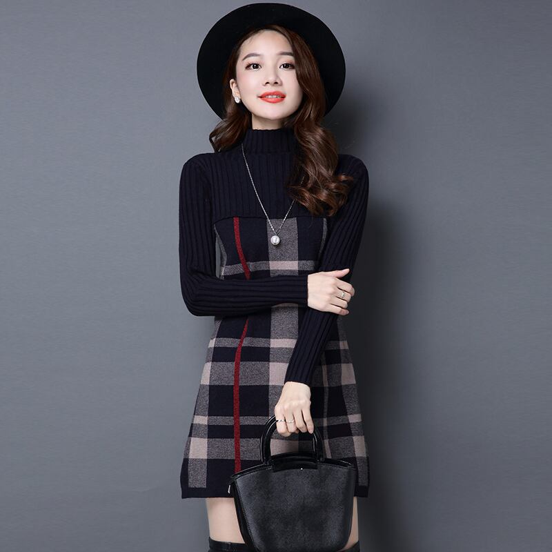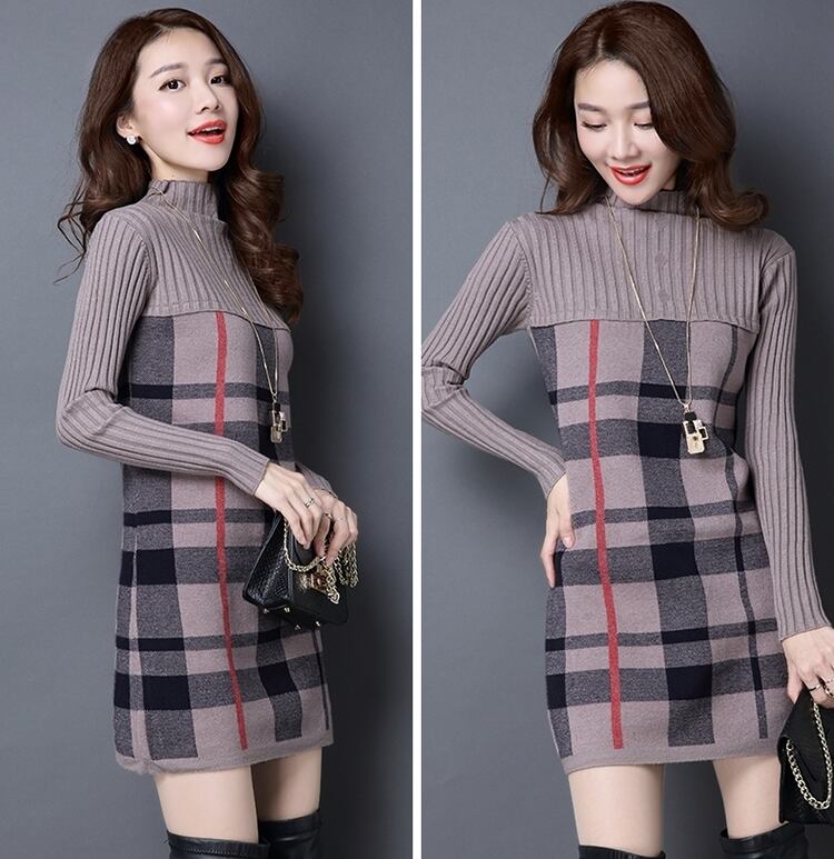 全3色 ワンピース ニットワンピース チェック柄 ミニ丈 セーター デート 女子会 カジュアル 大人可愛い スリム 上品 ハイネック 韓国ファッション 秋 春 冬