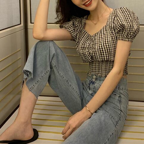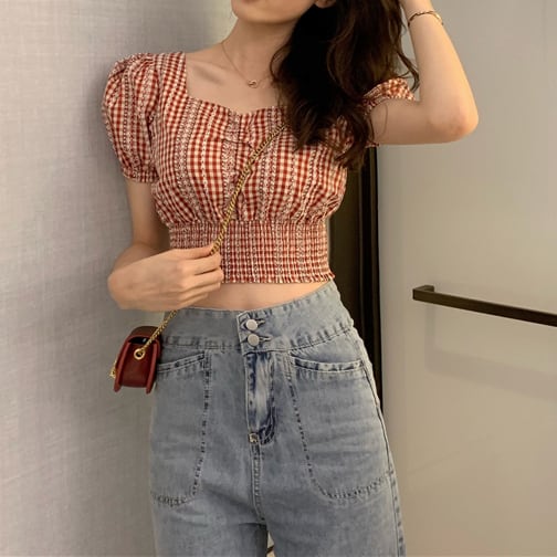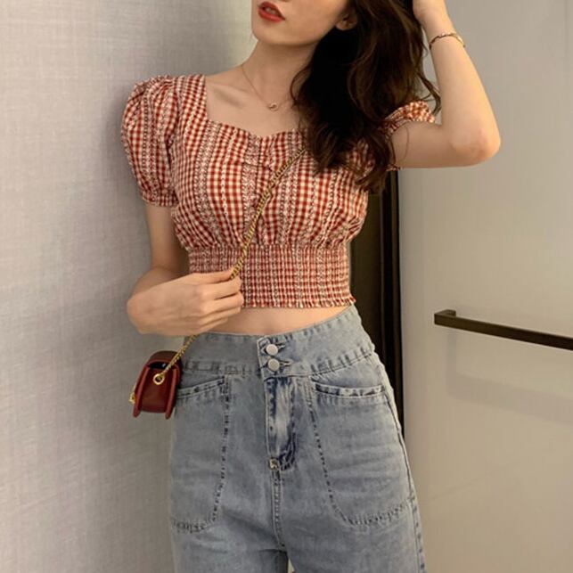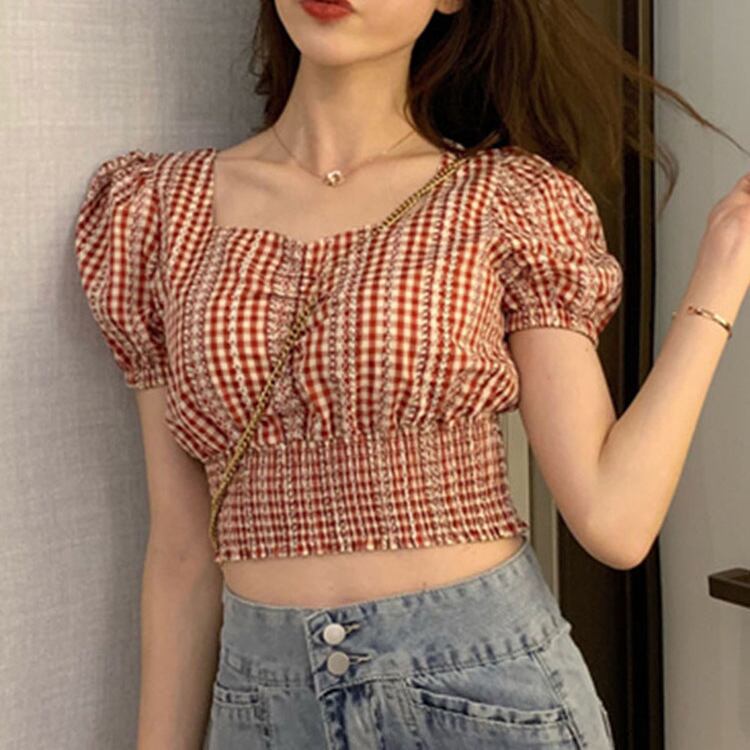 全2色 チェック柄 ギンガムチェック スクエアネック 半袖ブラウス ブラウス パフスリーブ ショート丈 ウエストマーク ガーリー カジュアル 可愛い お出かけ お買い物 デート 女子会 春 夏 レディース