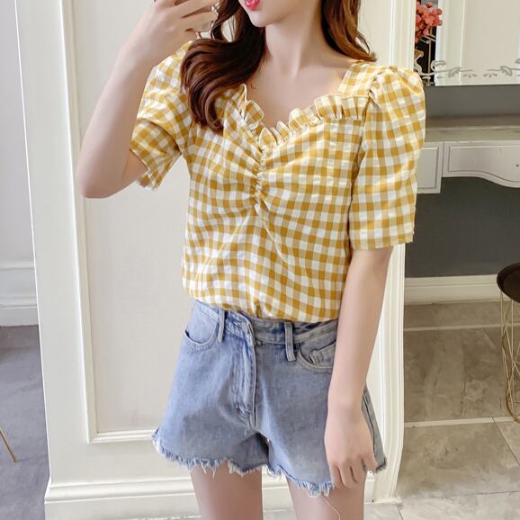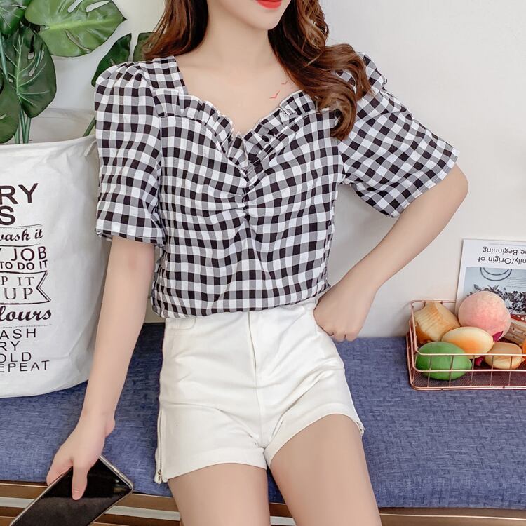全2色 チェック柄 ギンガムチェック Vネック フリル 半袖ブラウス ブラウス パフスリーブ ショート丈 ガーリー カジュアル 可愛い お出かけ お買い物 デート 女子会 夏 レディース