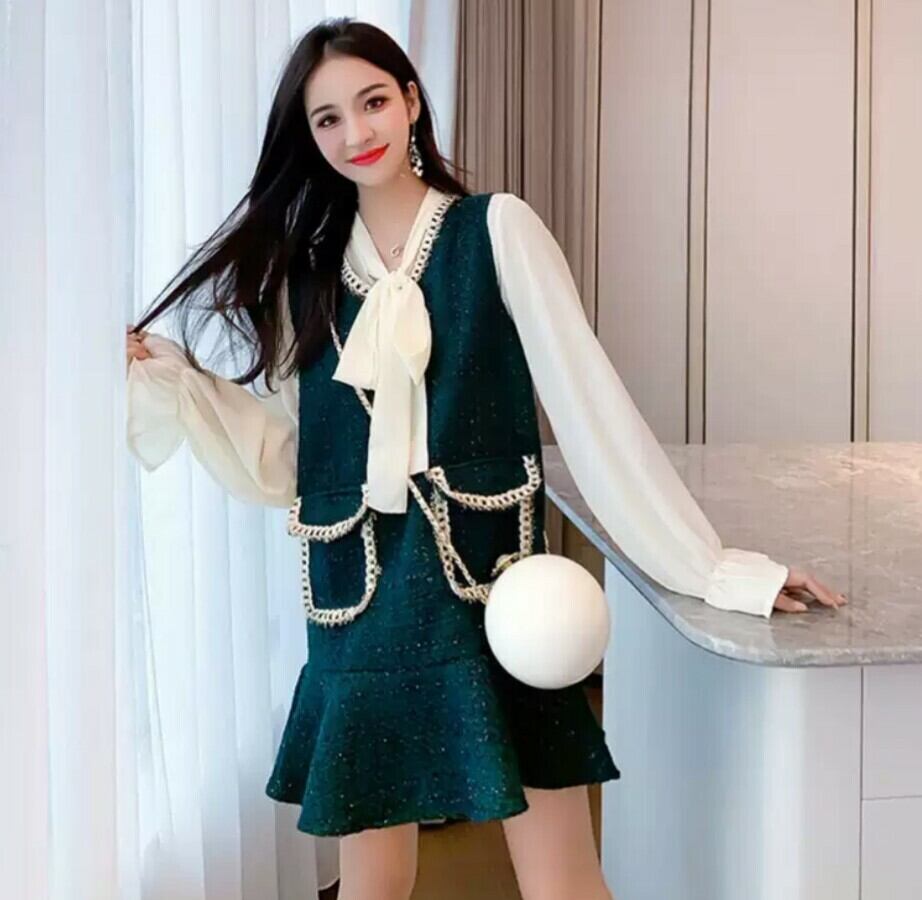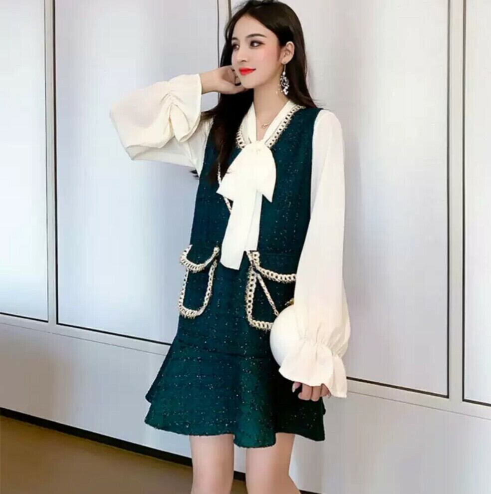 ツーピース ワンピース セットアップ ボウタイ ブラウス ミニ丈 フリルワンピ 春 ビショップ袖 デート 装飾 華やか ツイード